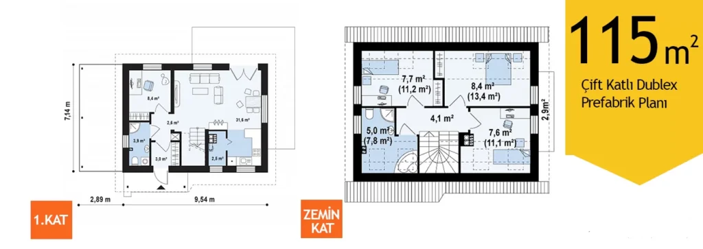 115 metrekarelik bir alan, aileler için geniş bir yaşam alanı sunar. Çift katlı tasarım, daha fazla oda veya depolama alanı sağlar. Prefabrik yapının çevre dostu malzemelerle üretilmesi, sürdürülebilir bir yaşam tarzını teşvik eder.